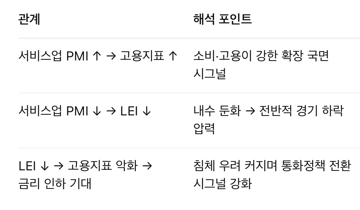 경제 흐름을 해석할 때, 단 하나의 지표만으로 판단하긴 어렵습니다. 그래서 우리는 복수의 지표들을 연결해서 해석해야 하고, 그 대표적인 3대 지표가 바로 서비스업 PMI / 경기선행지수(LEI) / 고용지표입니다.