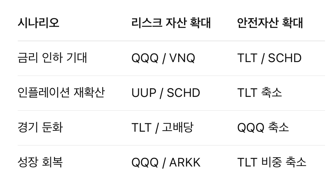 - CPI YoY가 0.3% 이하로 둔화될 경우 → QQQ / TLT 확대