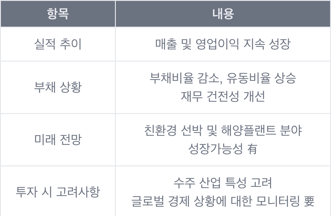 - 매출과 영업이익의 동반 상승은 고부가가치 친환경 선박 수주 확대와 생산 효율성 향상에서 기인한 것으로 보입니다.