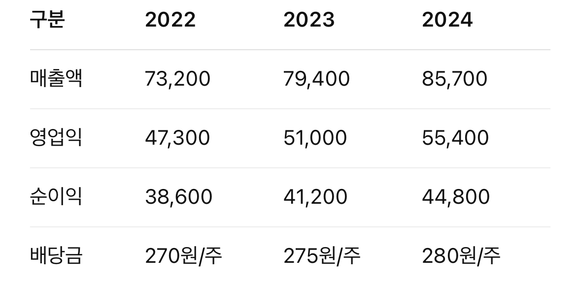 ※ DART 기준. 매년 안정적 성장세 및 배당 유지.