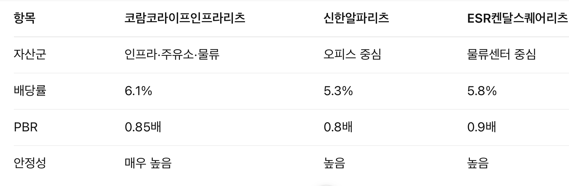 - 성장형 리츠에 비해 신규 자산 확장 속도 낮음