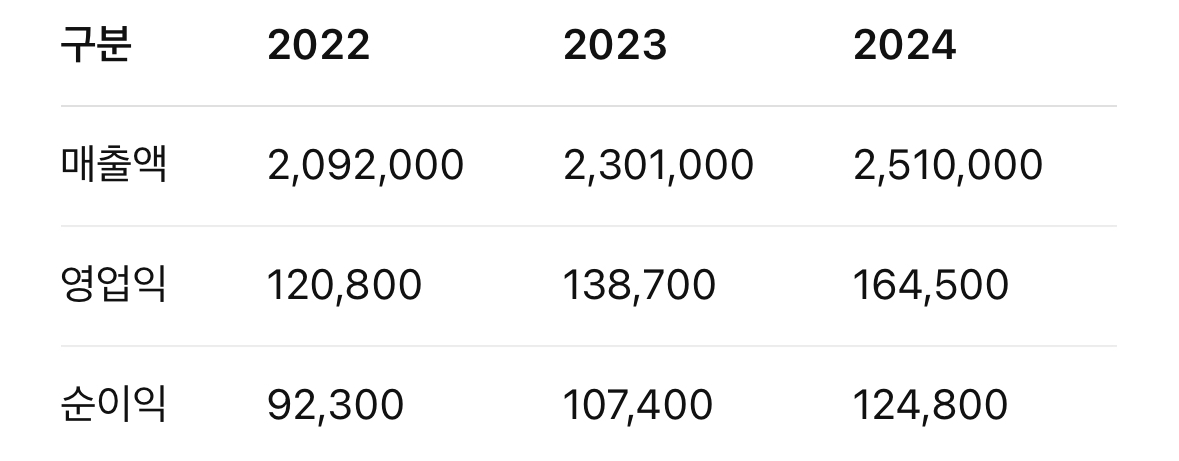📌 최근 3년 핵심 지표 (단위: 백만 원)