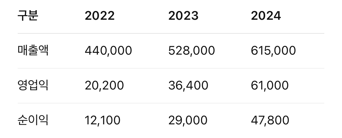 📊 최근 3년 핵심 지표 (단위: 백만 원)