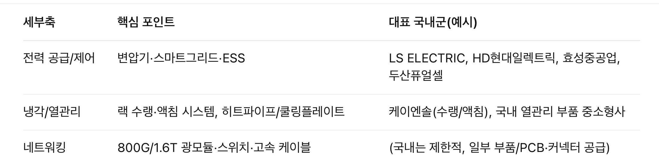 “엔비디아→데이터센터→전력/냉각/기판”으로 2차 수혜가 본격화. 전력 효율과 고속 연결·고층 기판이 핵심 병목입니다.