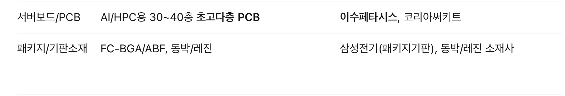 - 기판/PCB: AI 보드 다층화(층수↑, 동품질/미세회로화)로 단가·수익성 동반 상승
