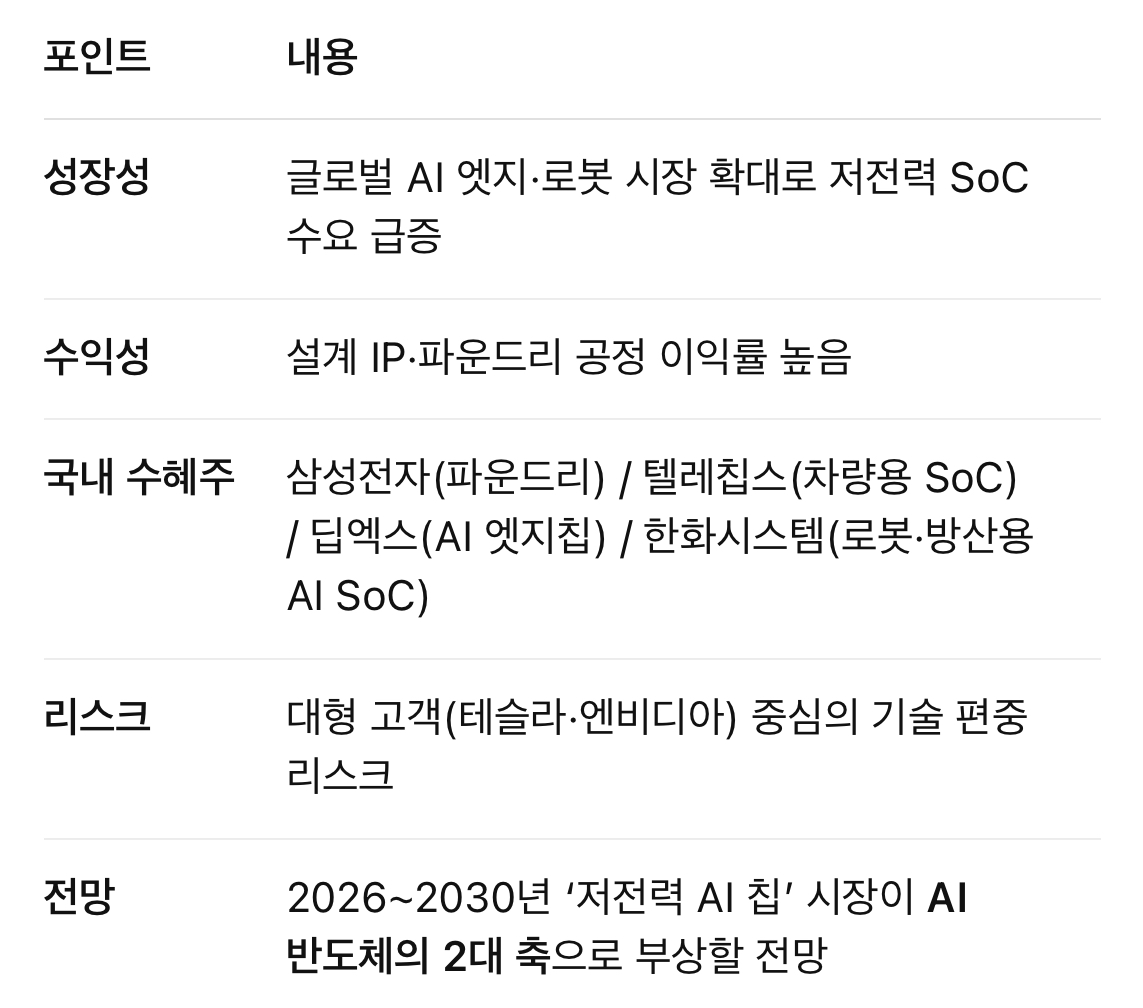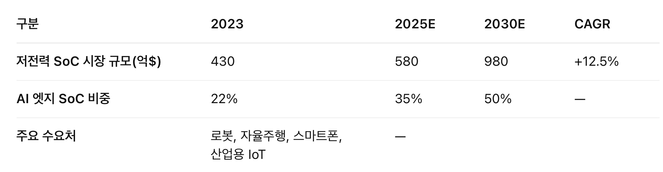 저전력 SoC는 “AI 시대의 전력 효율 엔진”으로, 데이터센터 중심의 연산에서 엣지·로봇·자율주행으로 확산되는 핵심 기술입니다.