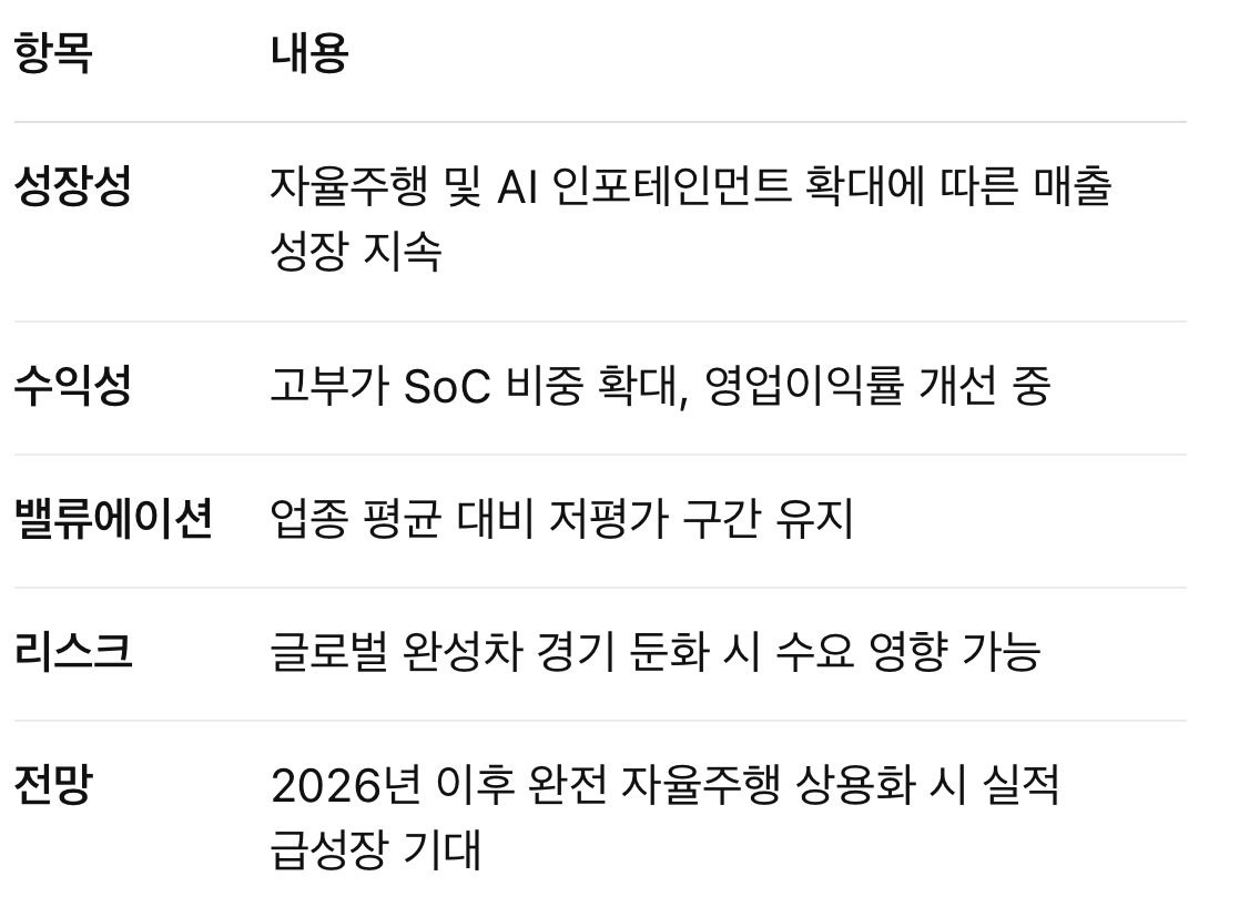 전장 반도체 수출 확대와 AI SoC 양산 뉴스플로우가 단기 모멘텀으로 작용할 전망입니다.