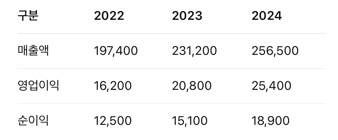 📊 최근 3년 핵심 재무지표 (단위: 백만 원)