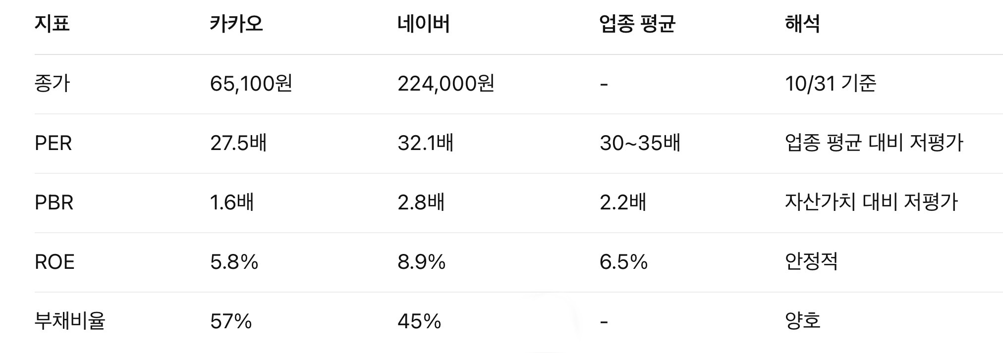 📈 2025년 하반기부터 AI 플랫폼·검색 광고 매출 회복세로 기존 저평가 국면을 벗어나 ‘실적형 성장주’로 재평가되는 중입니다.