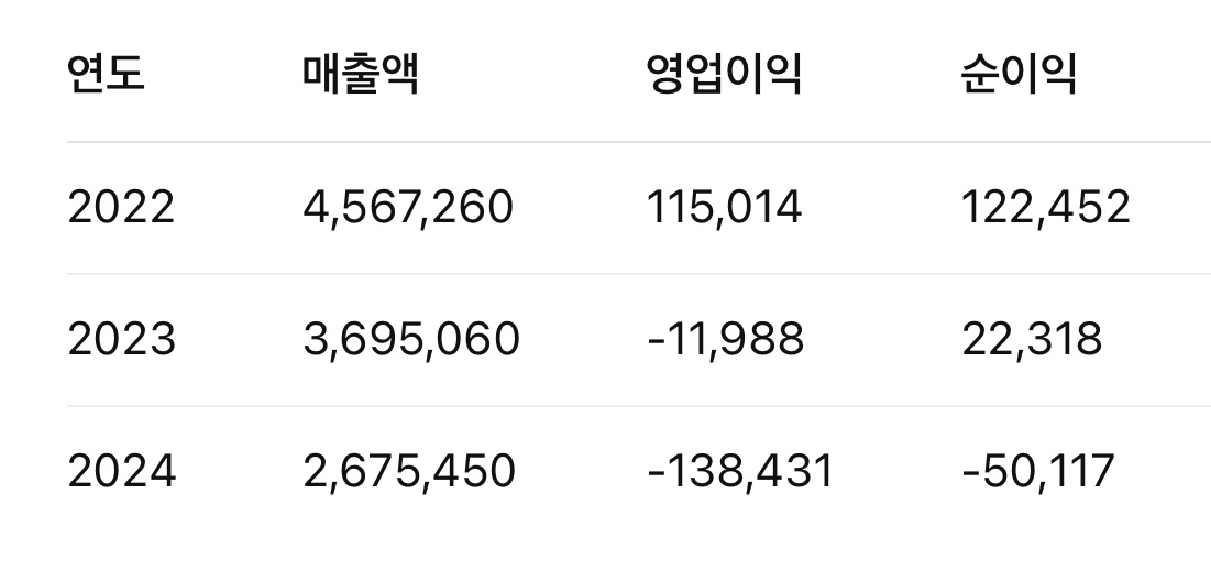 매출이 2022년 대비 점차 감소세이며, 영업이익과 순이익 모두 적자 전환 또는 적자 지속 상태이다. 수익성 회복이 중요한 과제