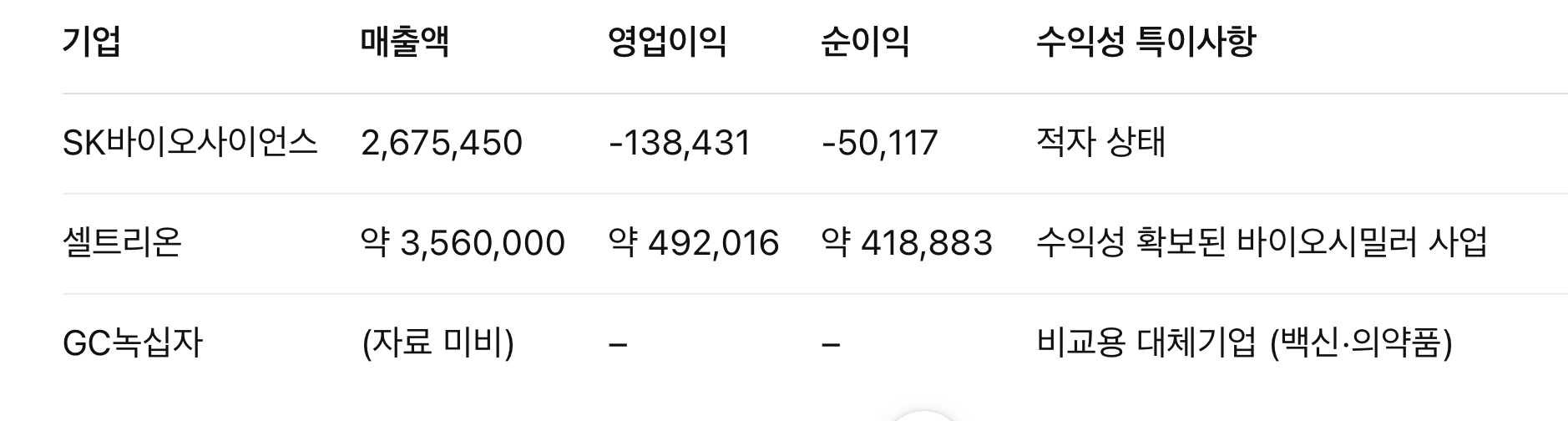 비교 결과, SK바이오사이언스는 매출 규모는 유의미하나 수익성 측면에서 경쟁사 대비 크게 뒤처져 있는 상태로 분석