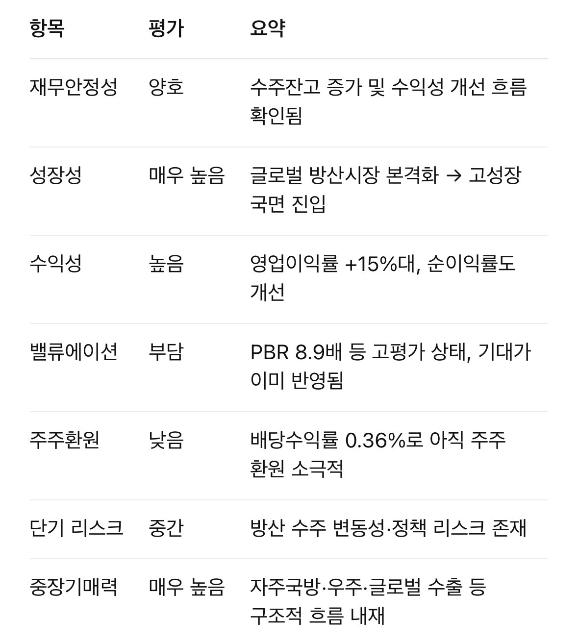최근에는 유럽·중동·미국 방산시장 진출 강화 및 우주산업 사업부 확장으로 중장기 성장 모멘텀이 부각되고 있다.