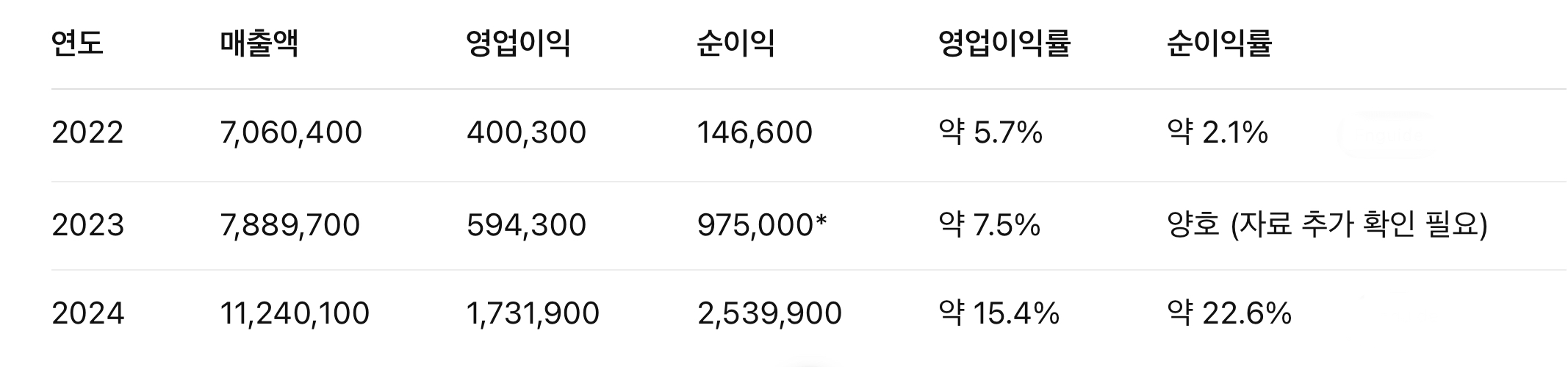 → 2022→2024년 매출액이 약 +59% 성장했으며, 영업이익 및 순이익이 대폭 개선 추세