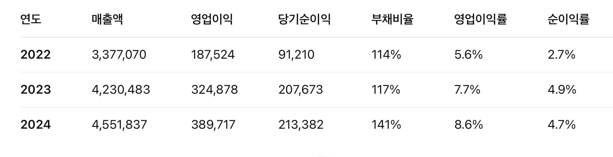 📊 최근 3년 핵심 지표 (연결 기준)