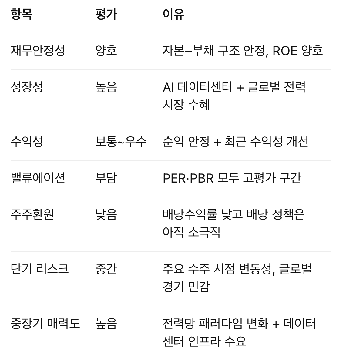 AI + 데이터센터 + 친환경 전력망 투자라는 구조적 성장 축 안에서 향후 5~10년간 안정적인 성장과 수익 확보가 기대.