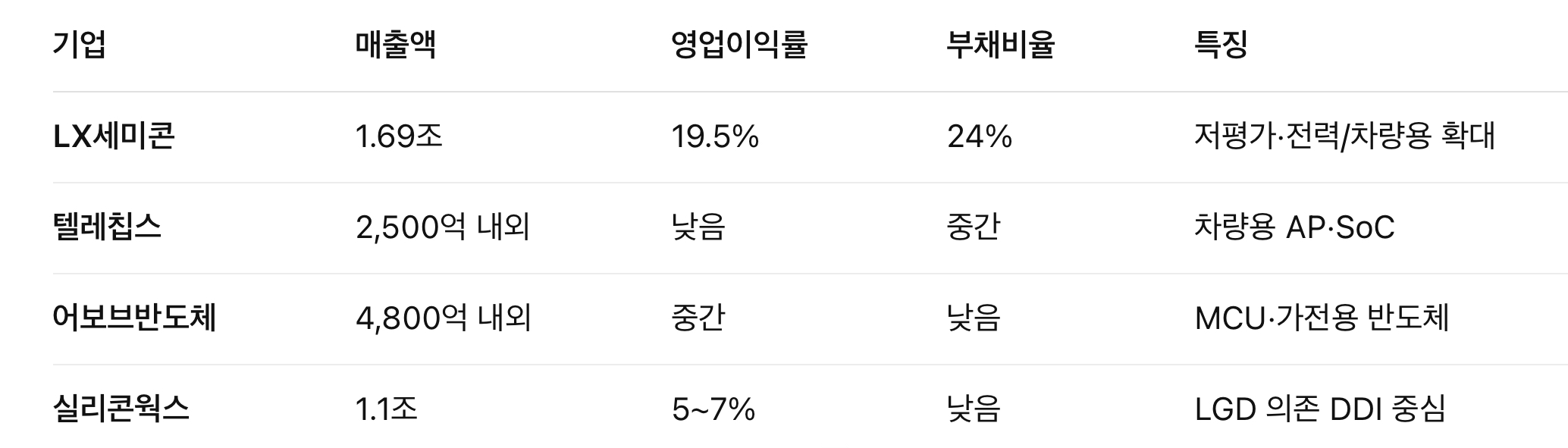 → LX세미콘은 국내 팹리스 중 규모 1위 + 수익성 상위권 + 재무구조 최상급