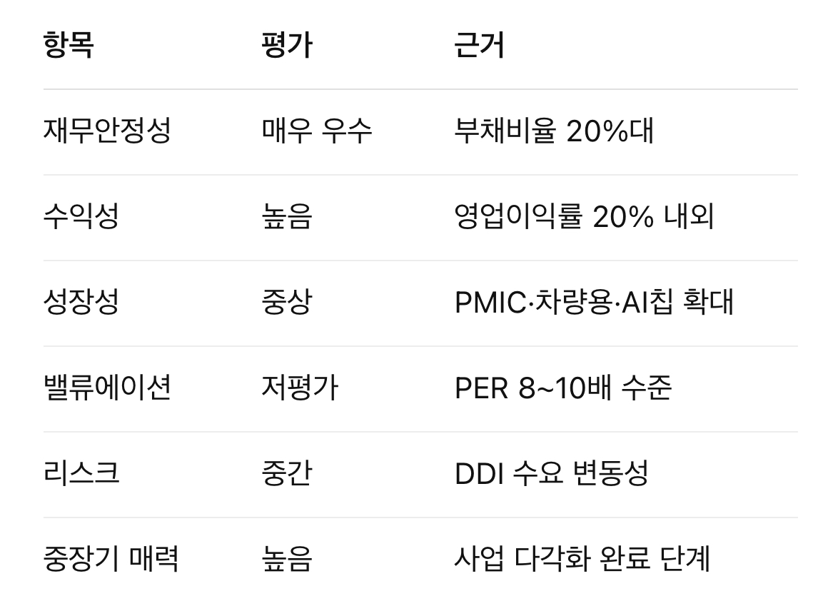 - DDI 의존도 완화 + PMIC·차량용·AI 칩 확대가 실적 회복 요인