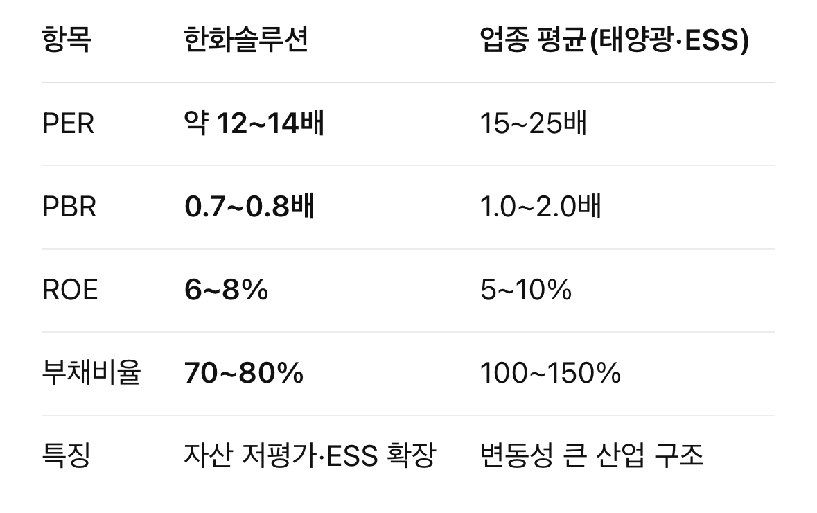→ 태양광 업종 대비 PER·PBR 모두 저평가이며, ROE도 중간 이상으로 안정적