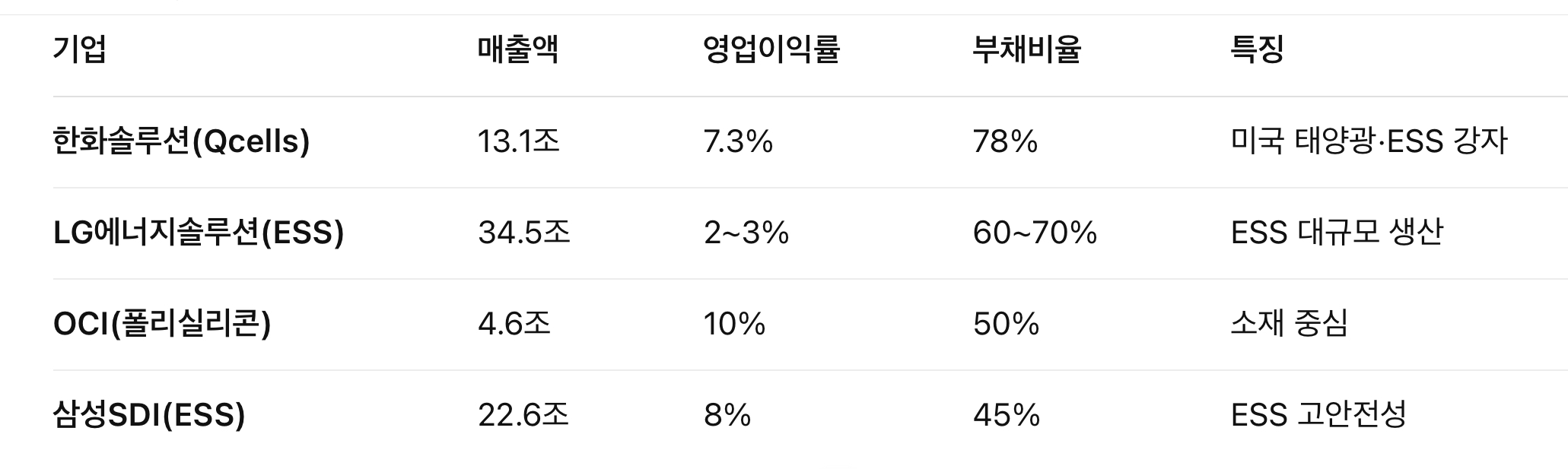 → 한화솔루션은 태양광 제조+ESS+인버터+전력 솔루션까지 갖춘 *“통합형 에너지 기업”*이라는 점에서 차별성이 있다.