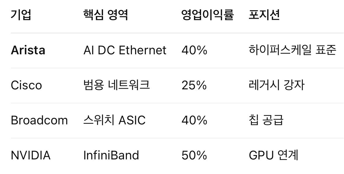 엔비디아가 “연산의 표준”이라면, Arista는 “AI 데이터센터 네트워크의 표준”으로 평가된다.